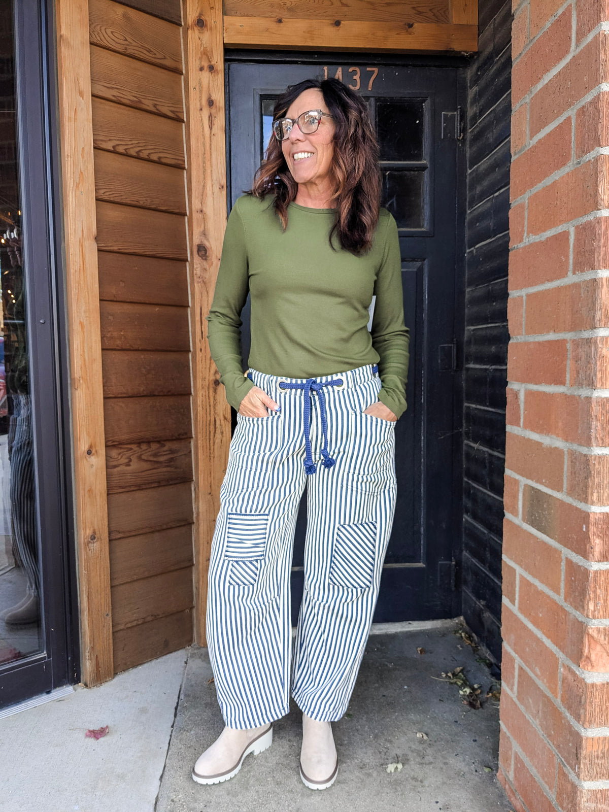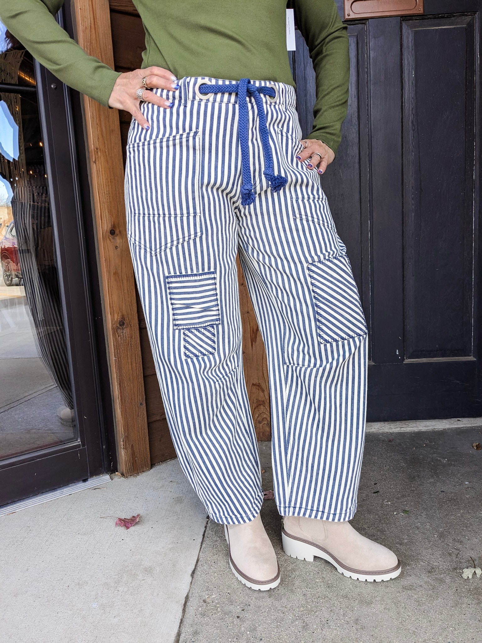 Special details: Barrel pants, large pockets, patchwork details, button fly, rope tie waistband