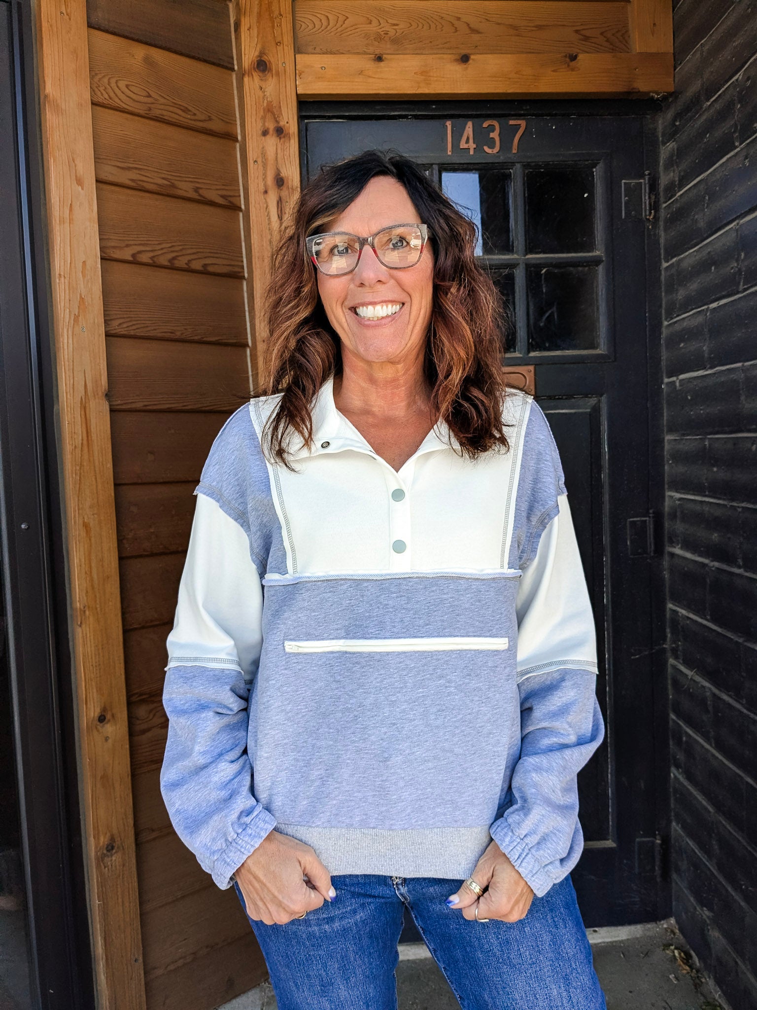 Special details: Snap buttons, front zipper pocket, raw edges.