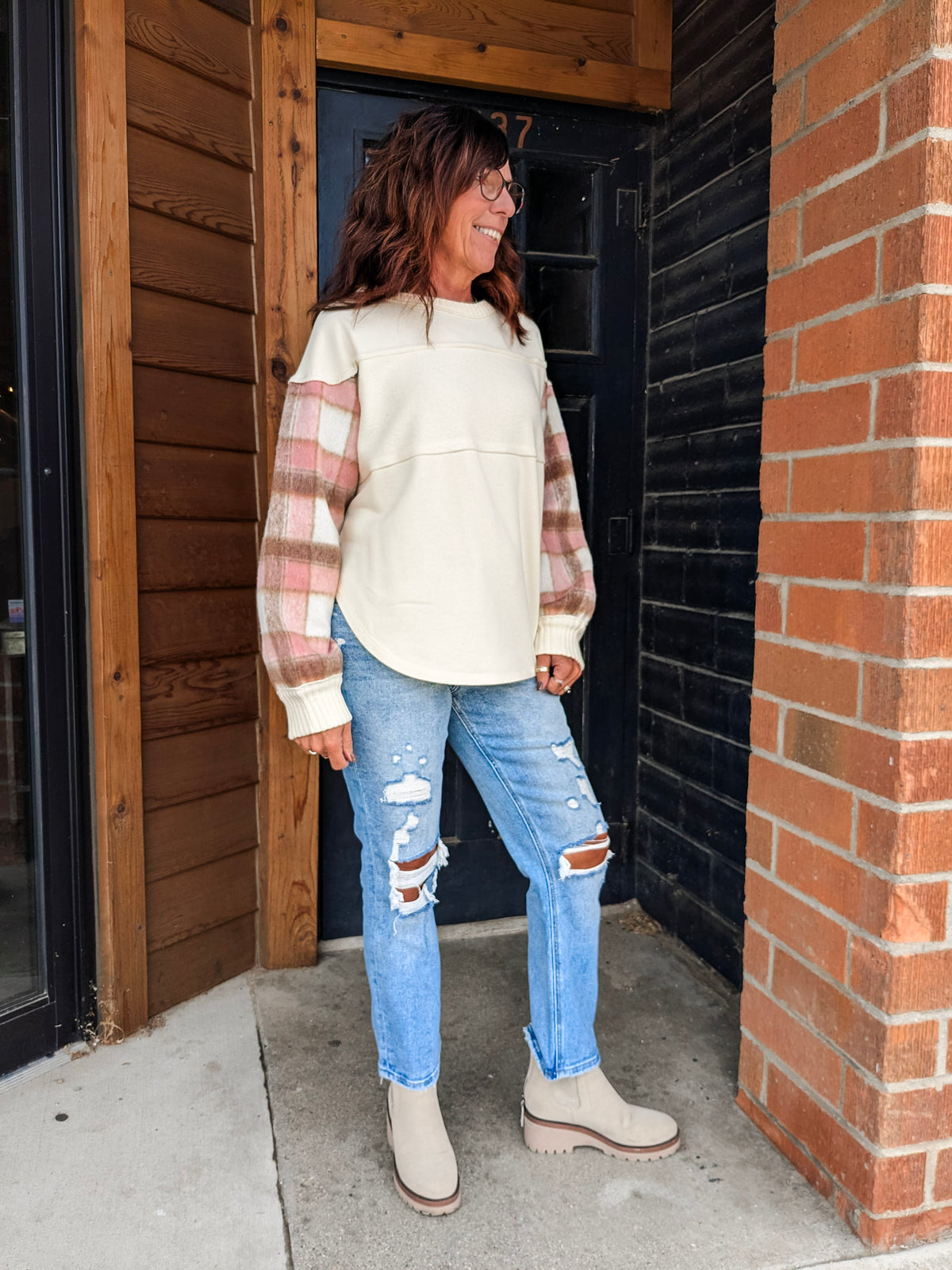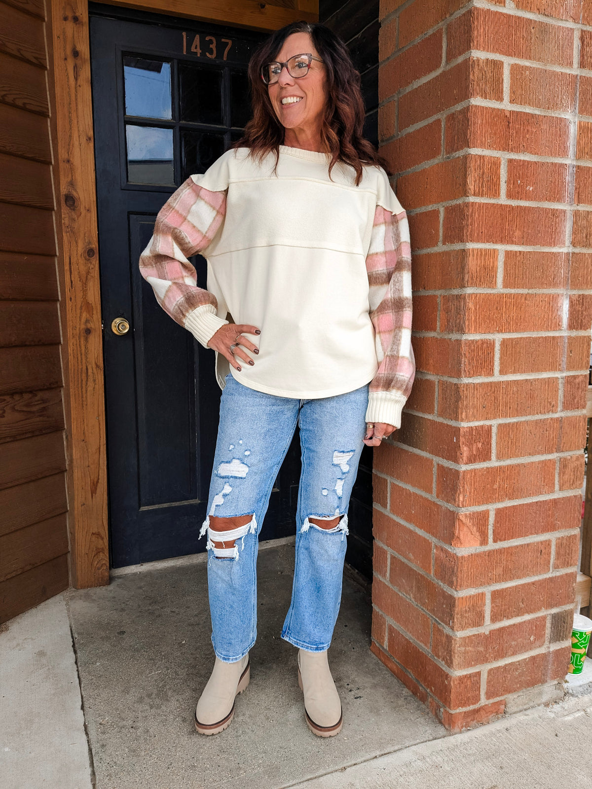 Special details: Pink, brown and ivory textured sleeves, scoop hem