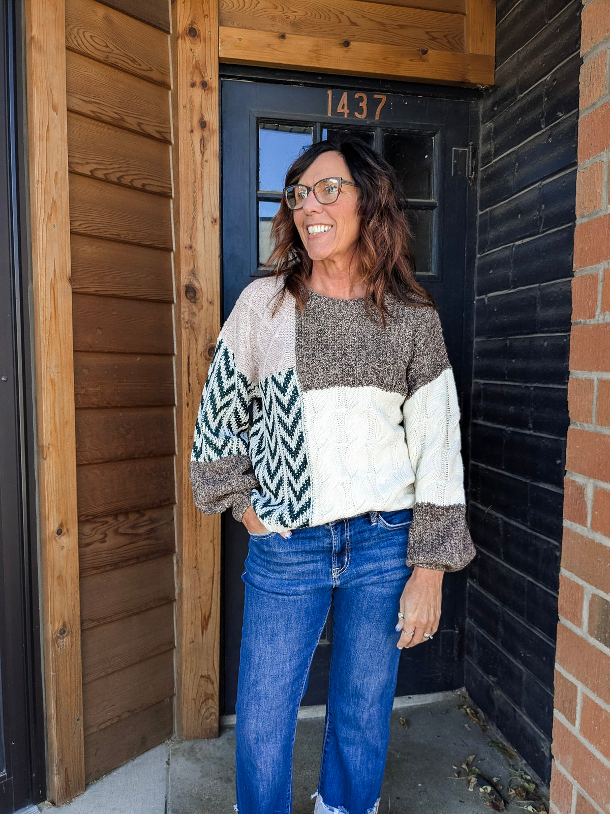 Special details: Patchwork, loose fit, knit, back tie knot.