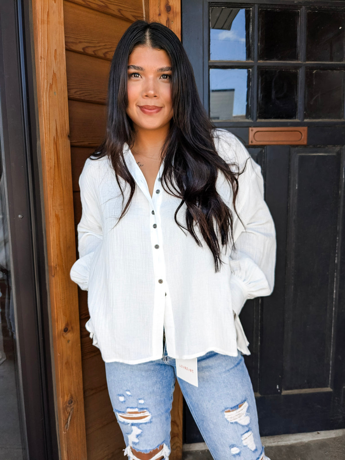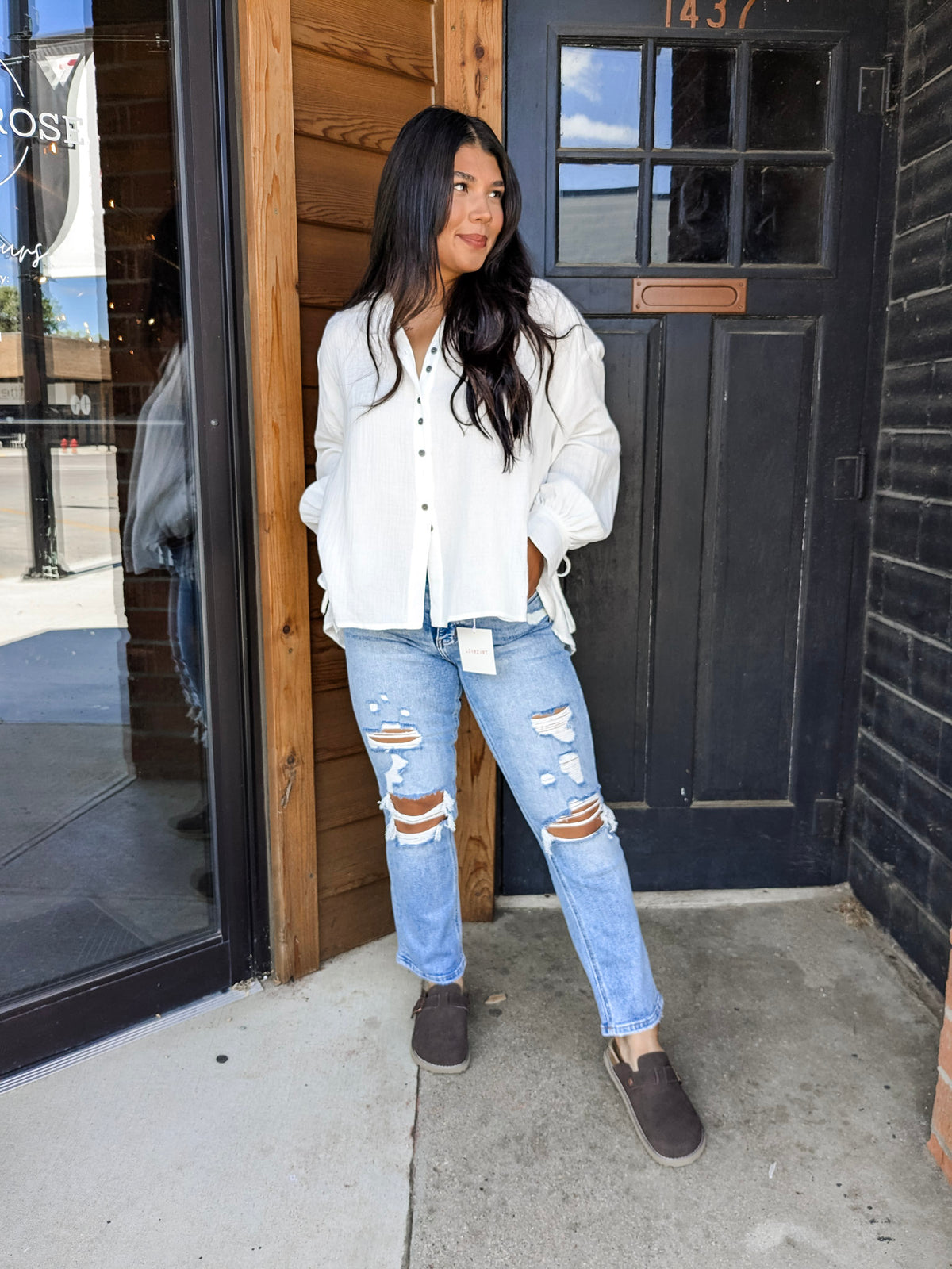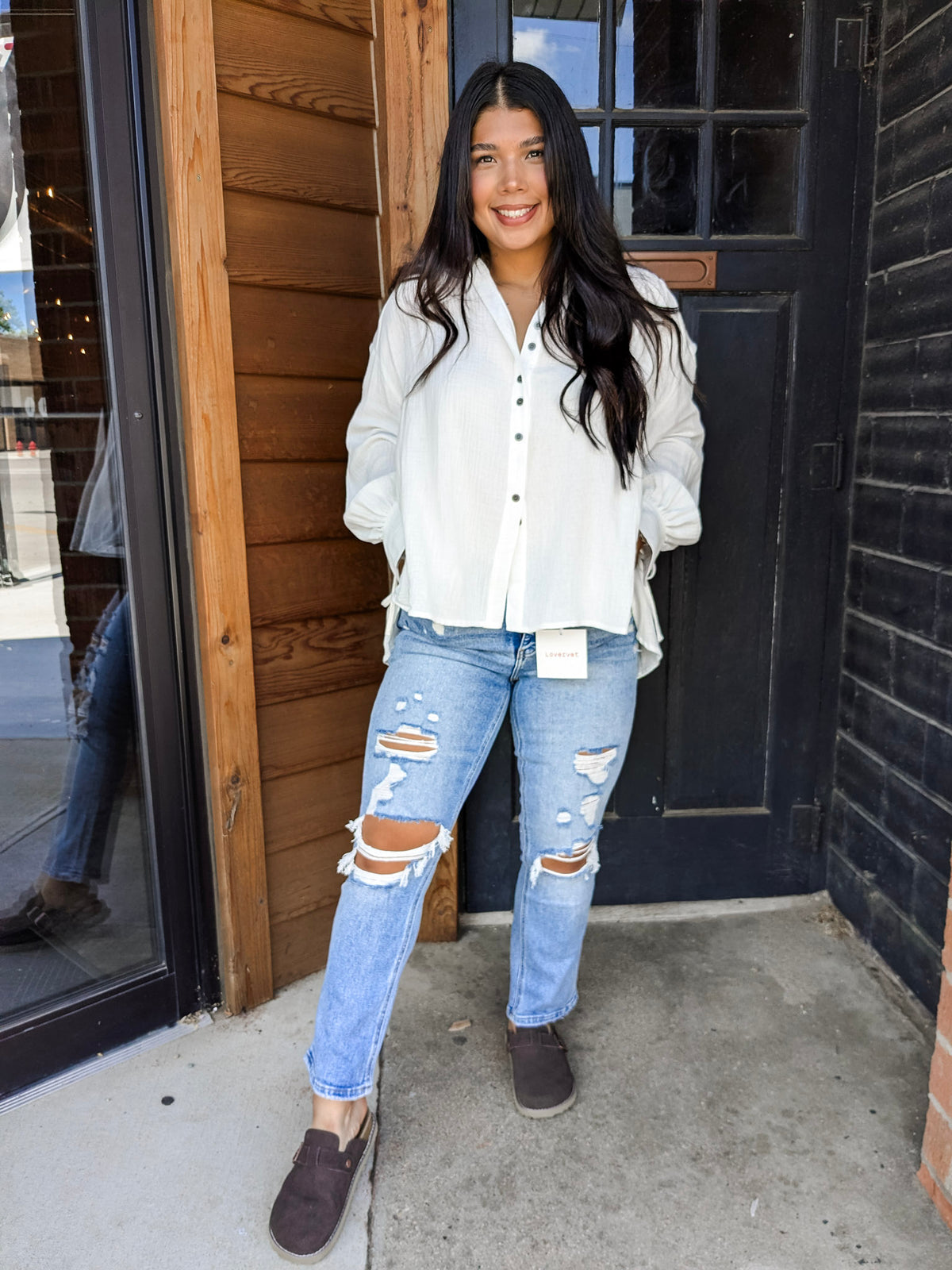 Special details: Front buttons, collar, slit sides, hi-low, tie cuffs