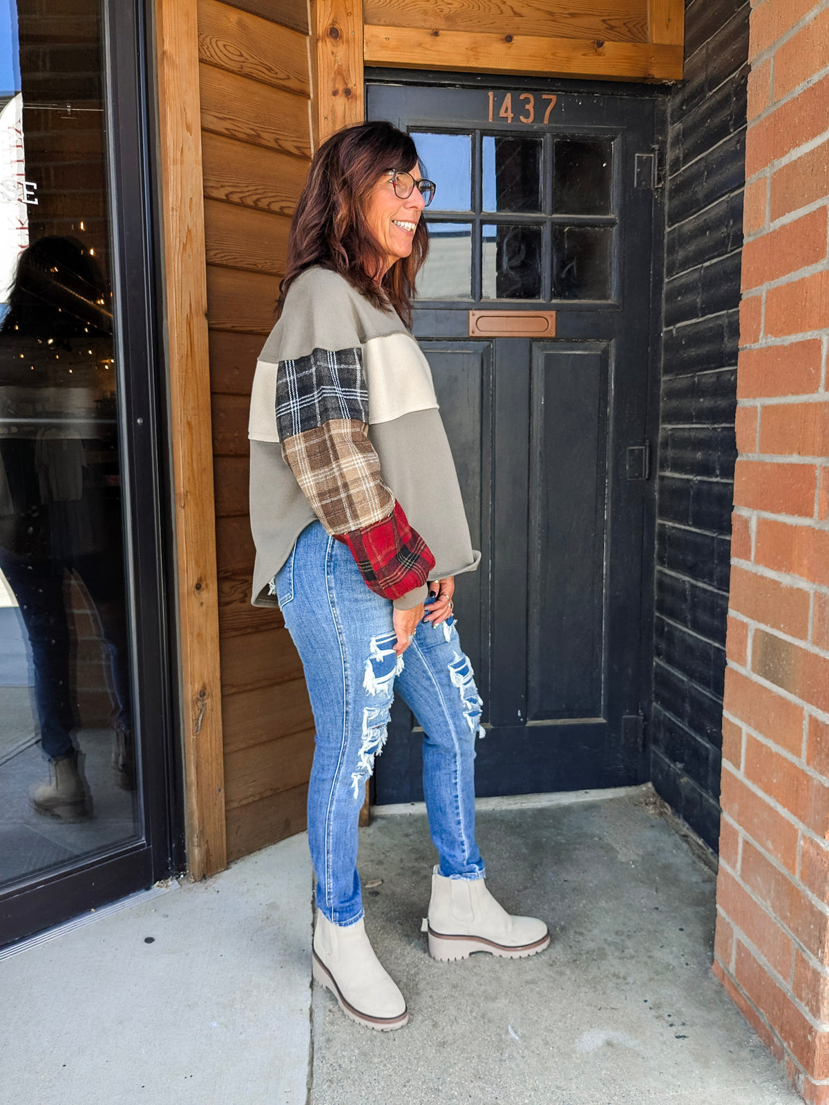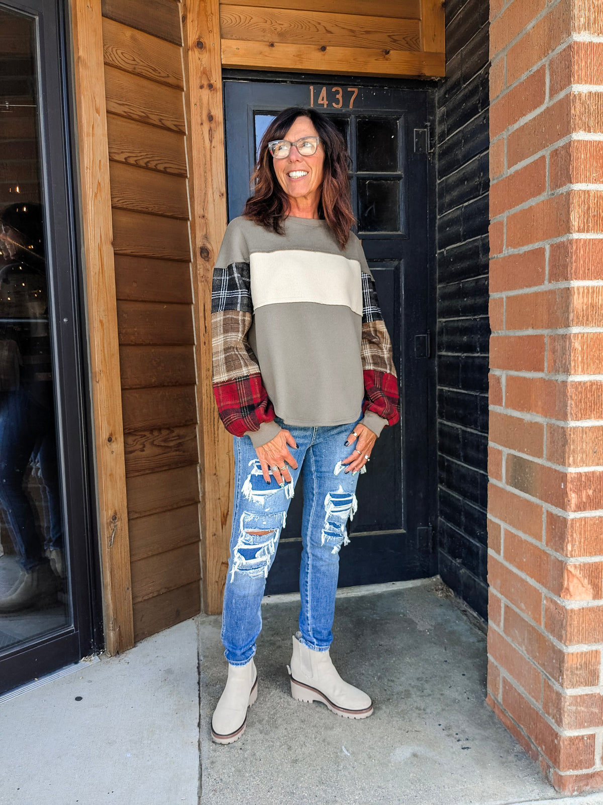 Special details: Red, brown, and black patchwork flannel sleeves, middle colorblock, dolphin hem.