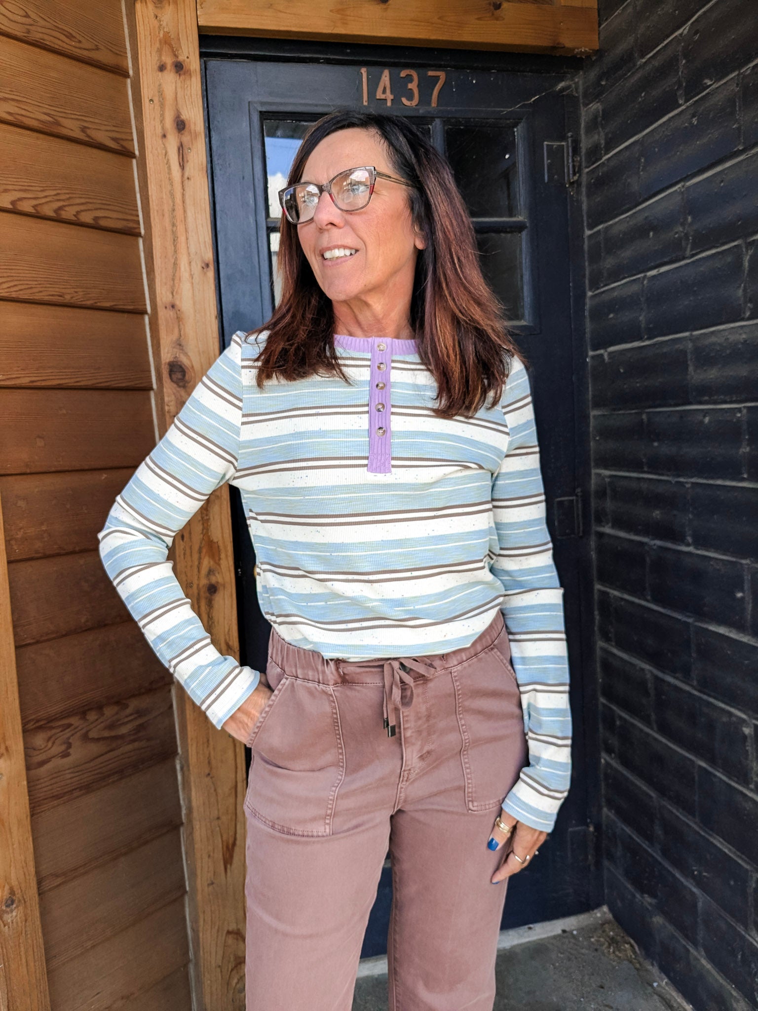 Special details:  Henley top with front half buttons, contrast purple neckline, ribbed.