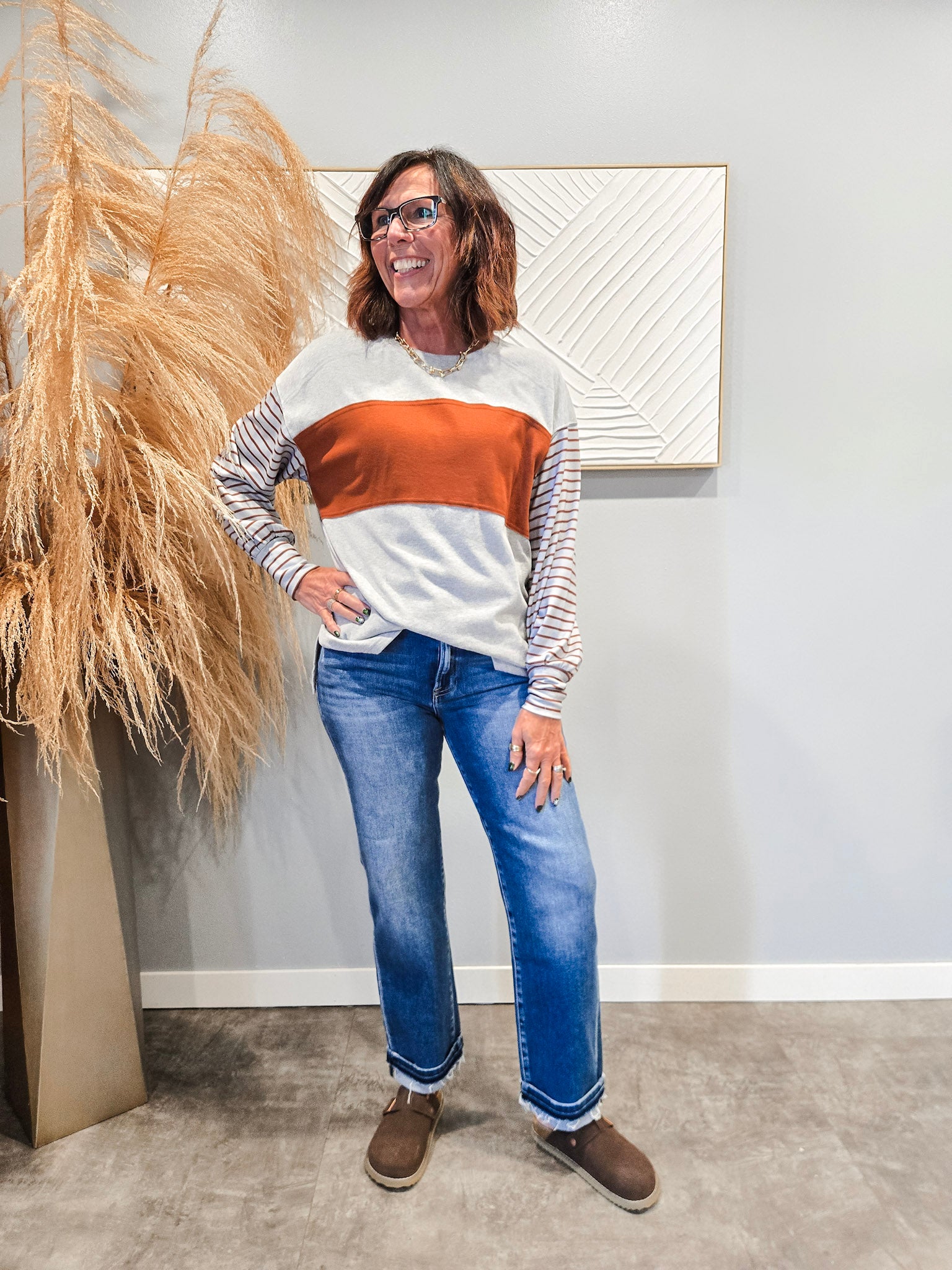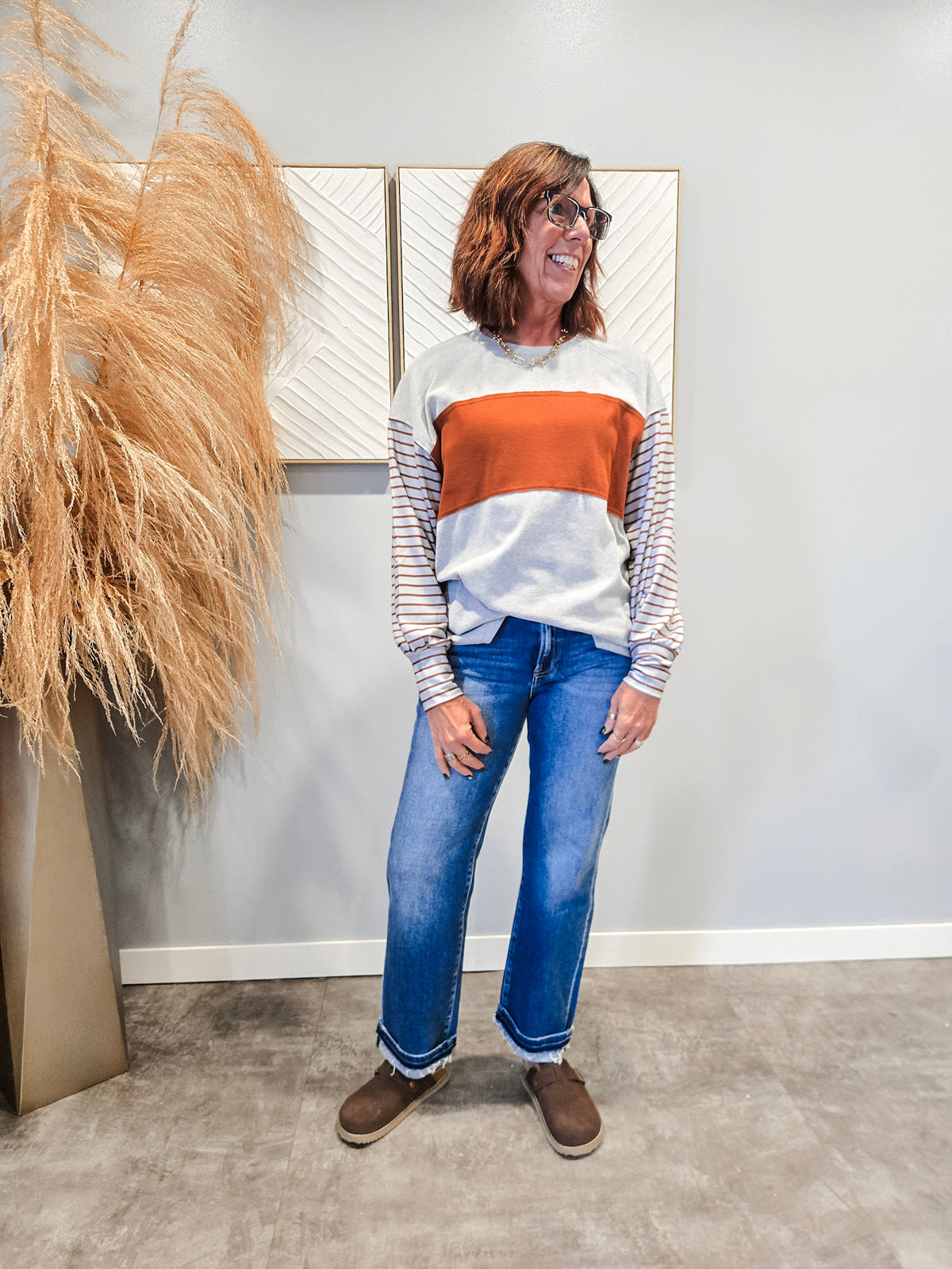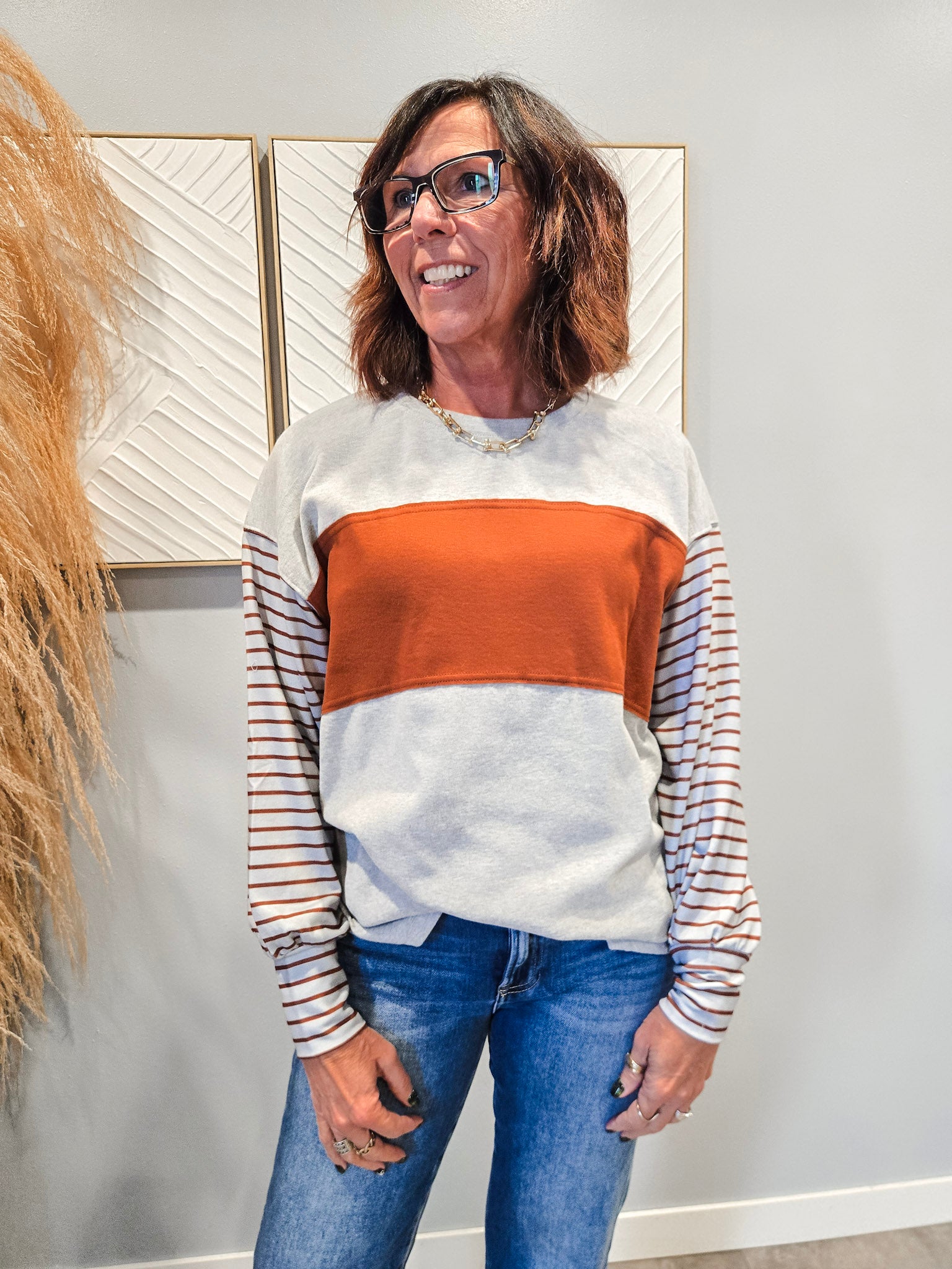 Special details: Long stripe bishop sleeve, colorblock.