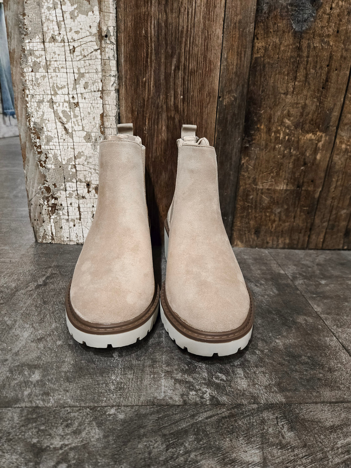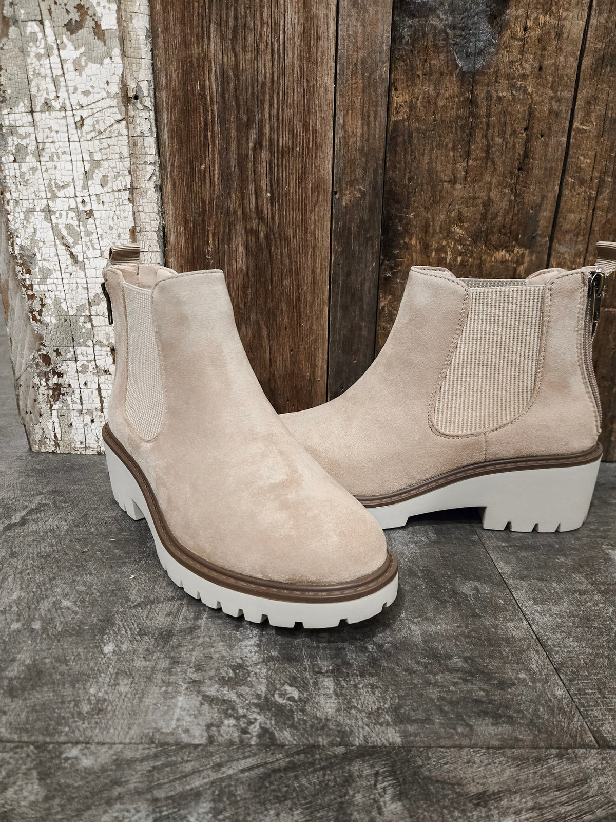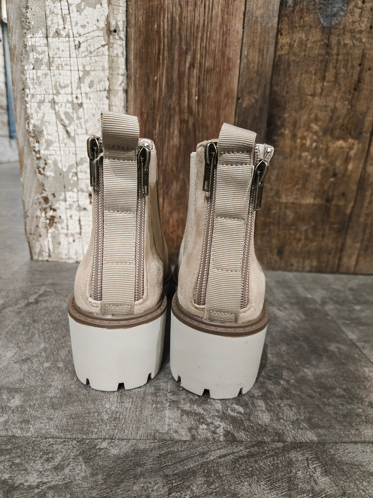 Zipper back, small platform heel, elastic sides.