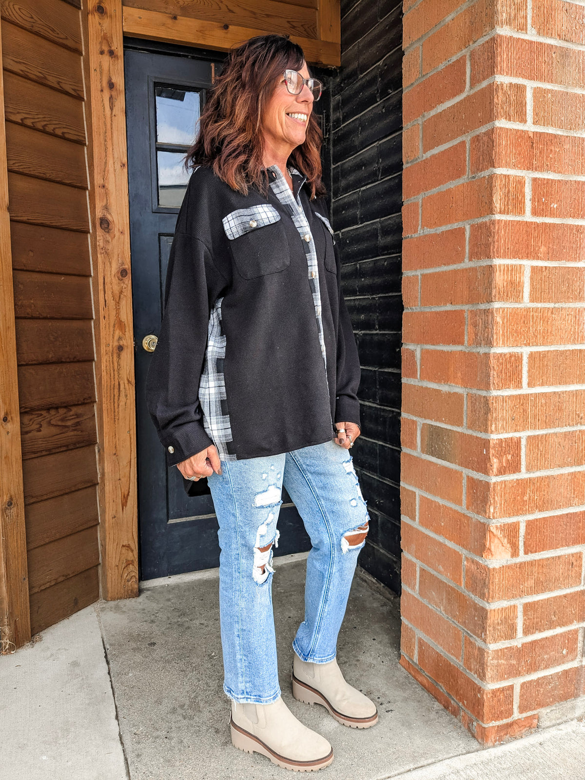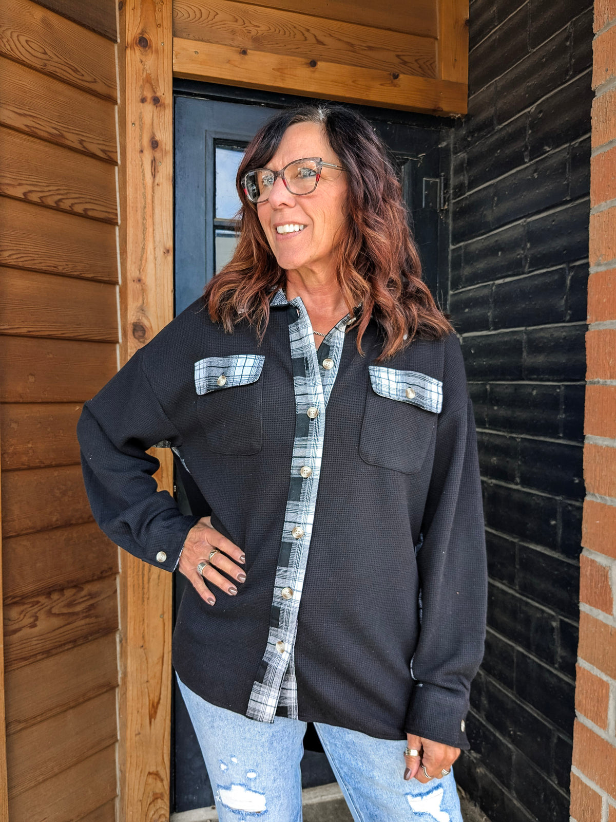 Special details: Plaid patchwork, front buttons, button check flap pockets.