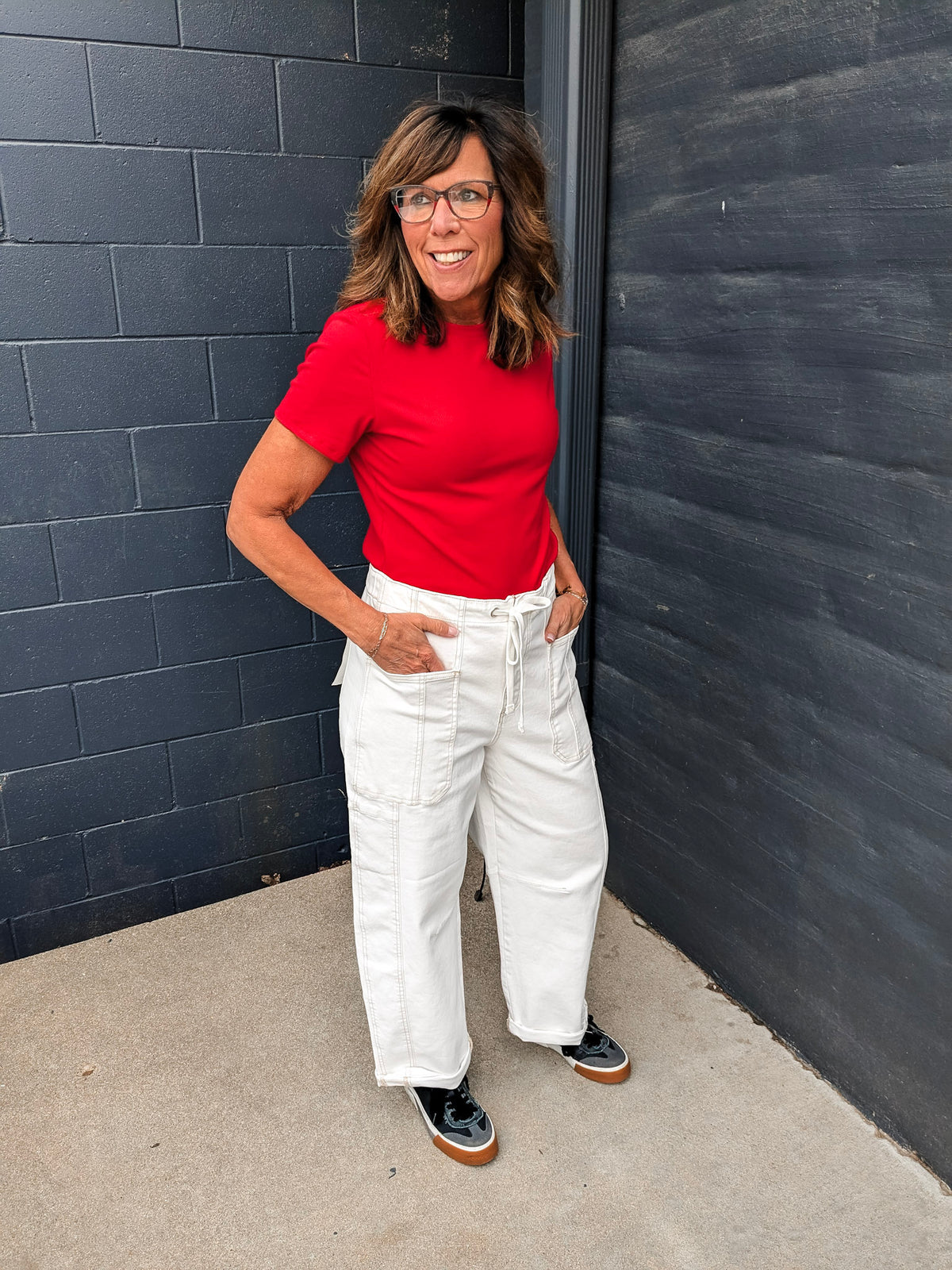 Special details: High rise, crop-cuffed, cargo pockets, drawstring waist