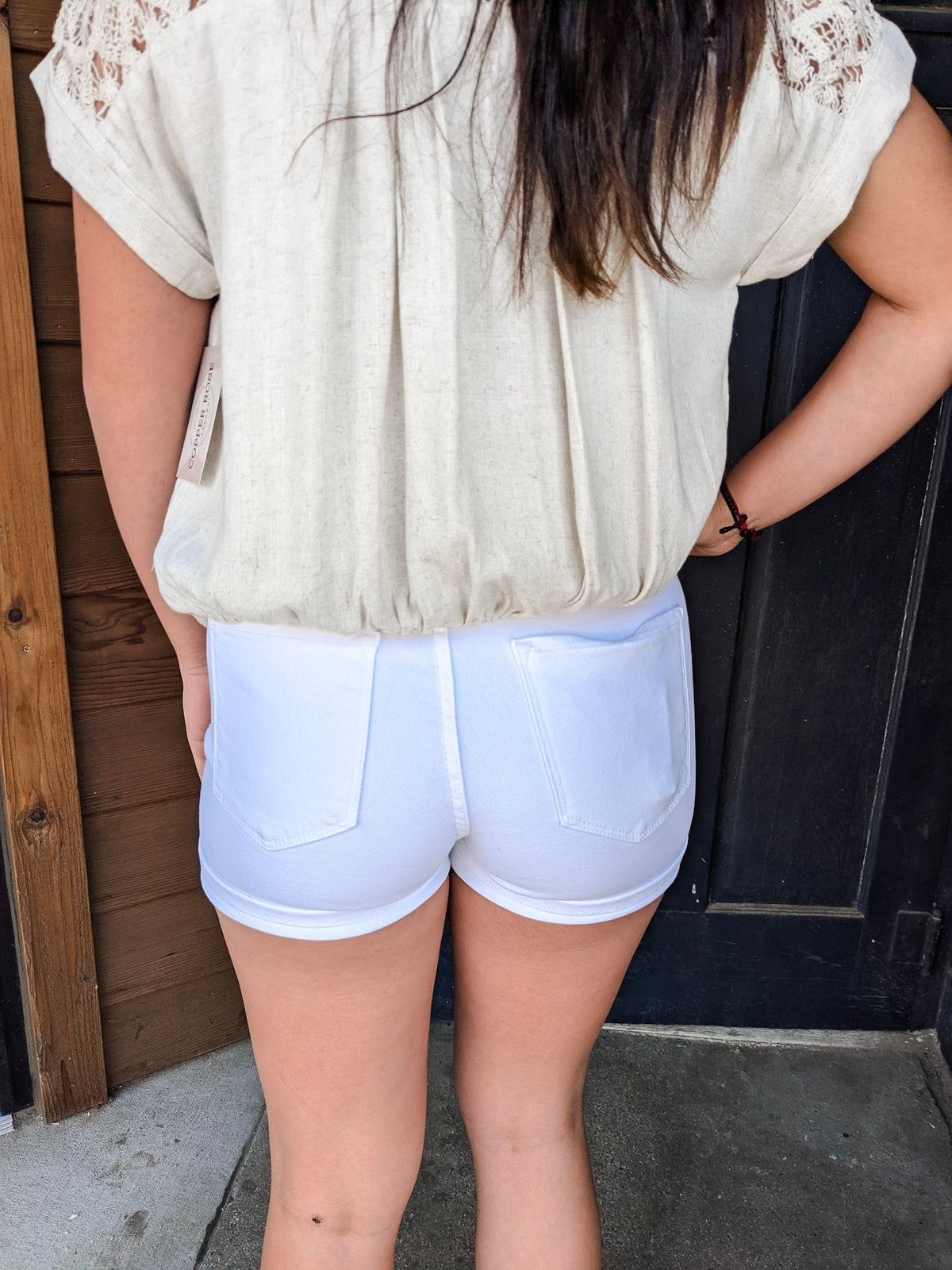 Special details: Crochet contrast, button down, drawstring hem, elastic back hem.