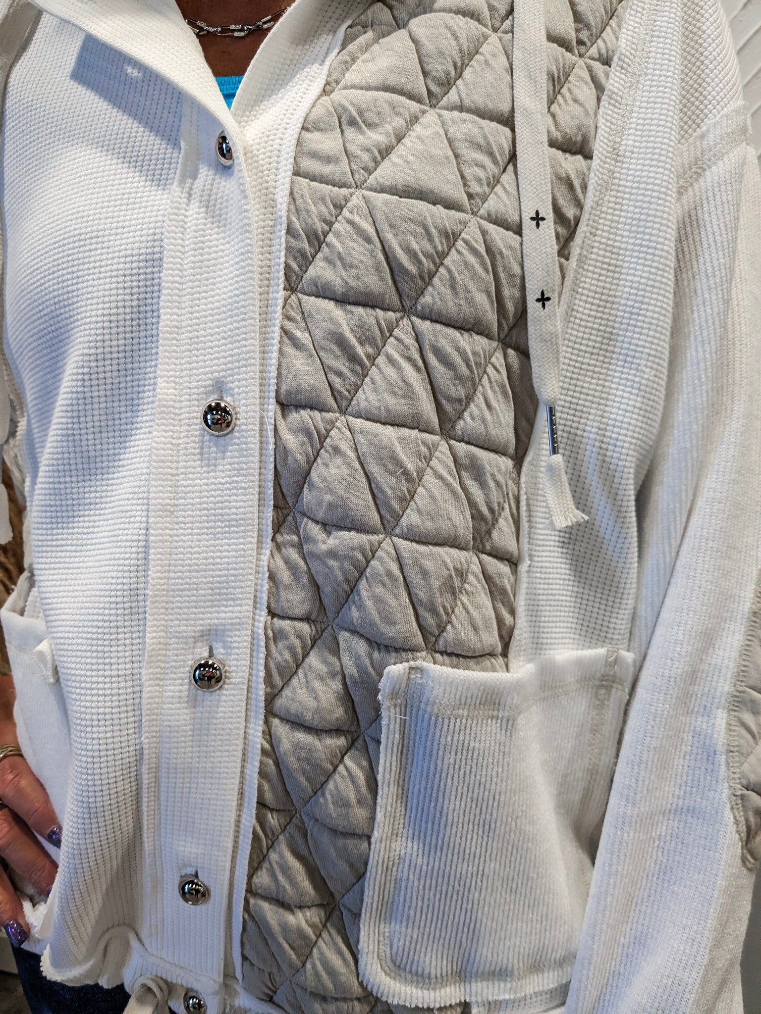 Special details: Drawstring hood, quilted patchwork, drawstring hem, front pockets, front buttons.