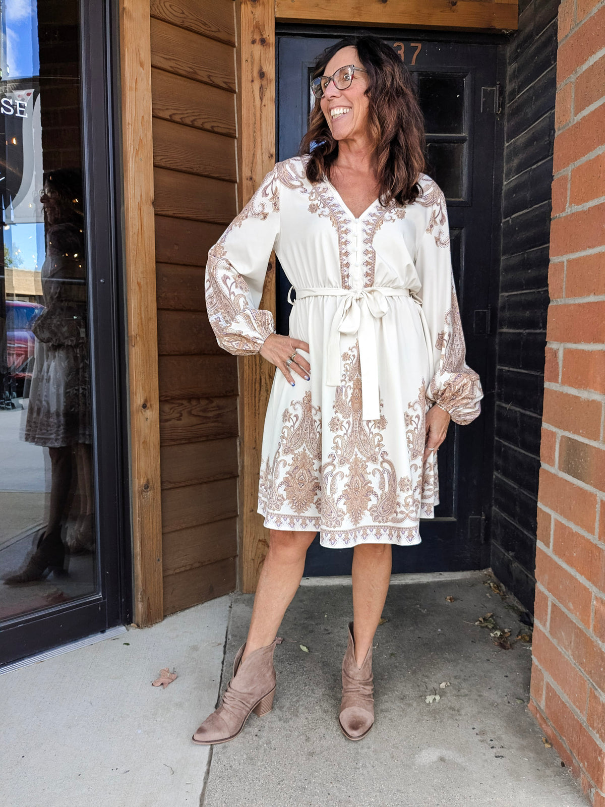 Special details: V-Neck, tie waist, long sleeve.