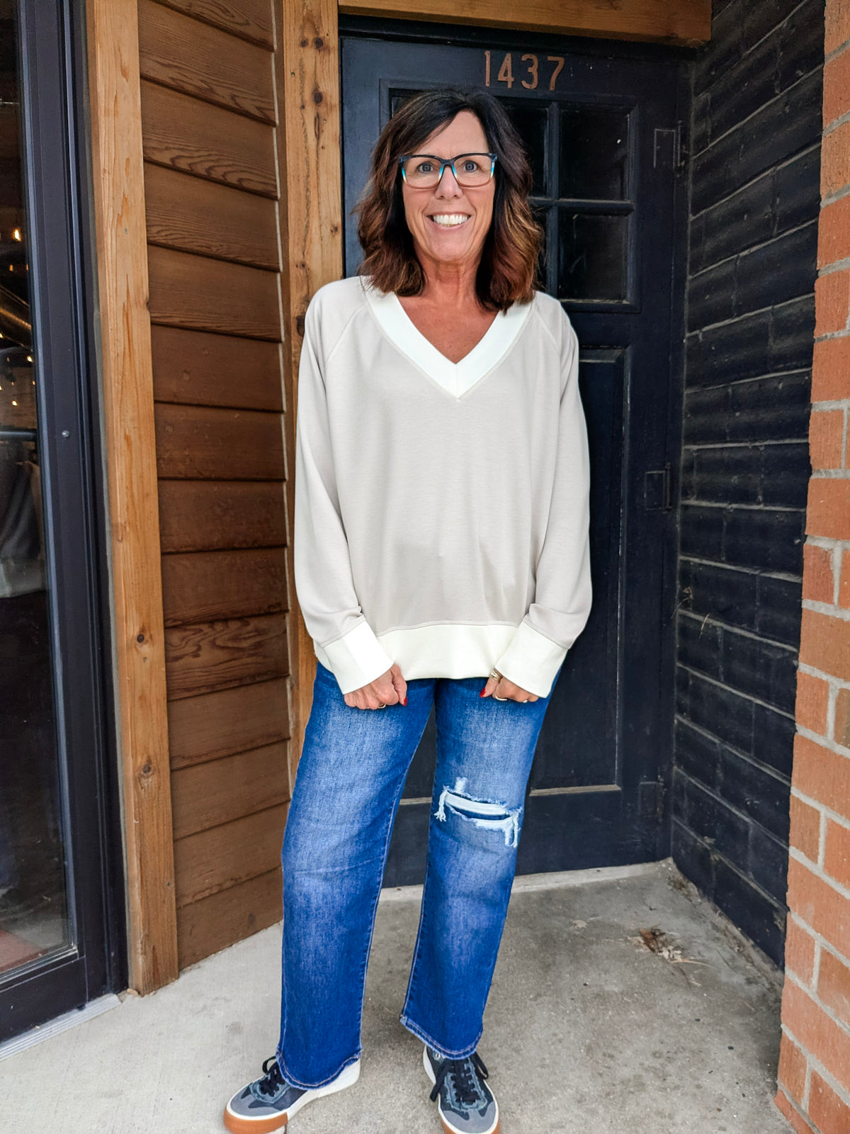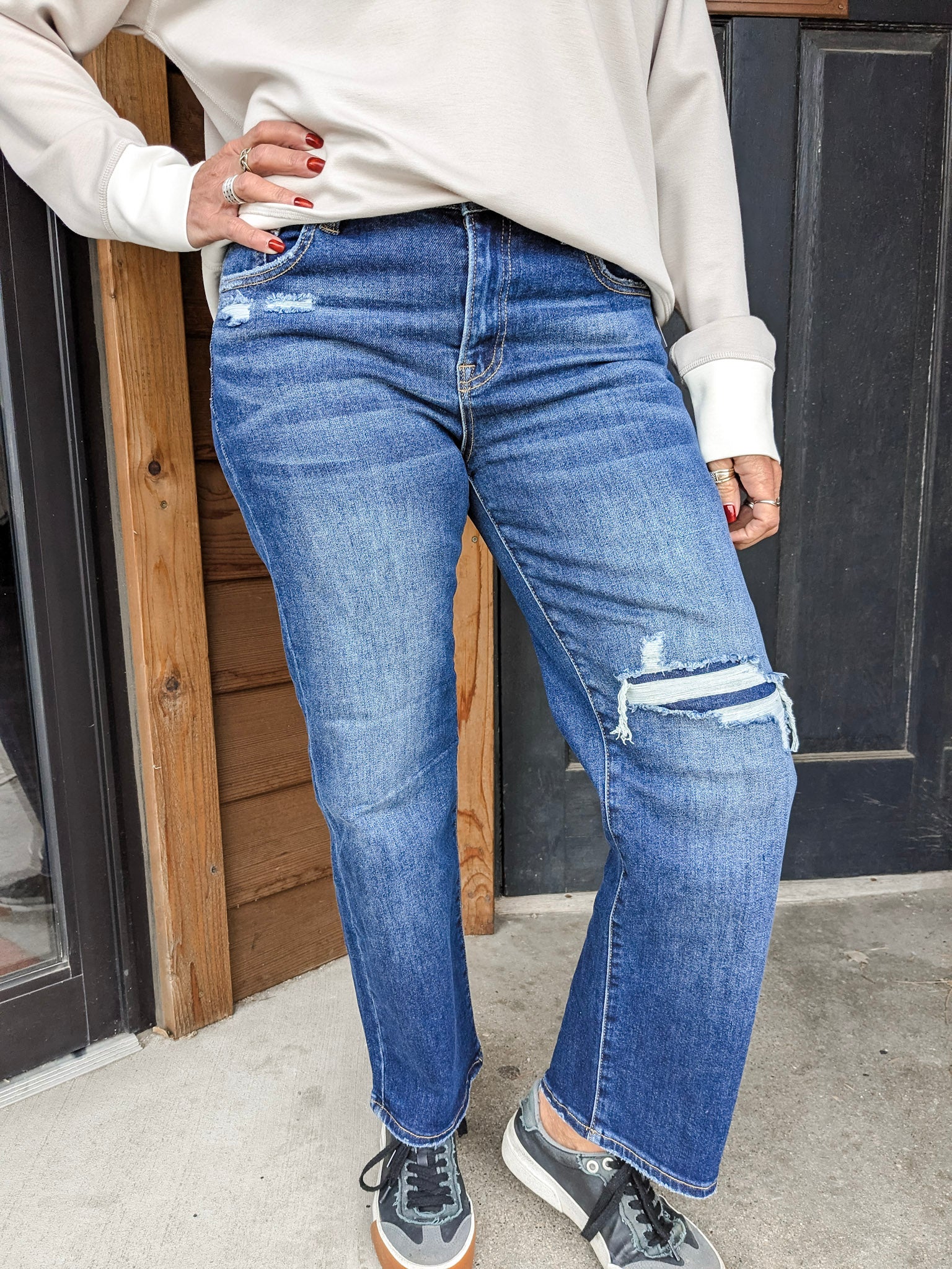 Special details: High rise, crop, slim straight, hidden knee patch.