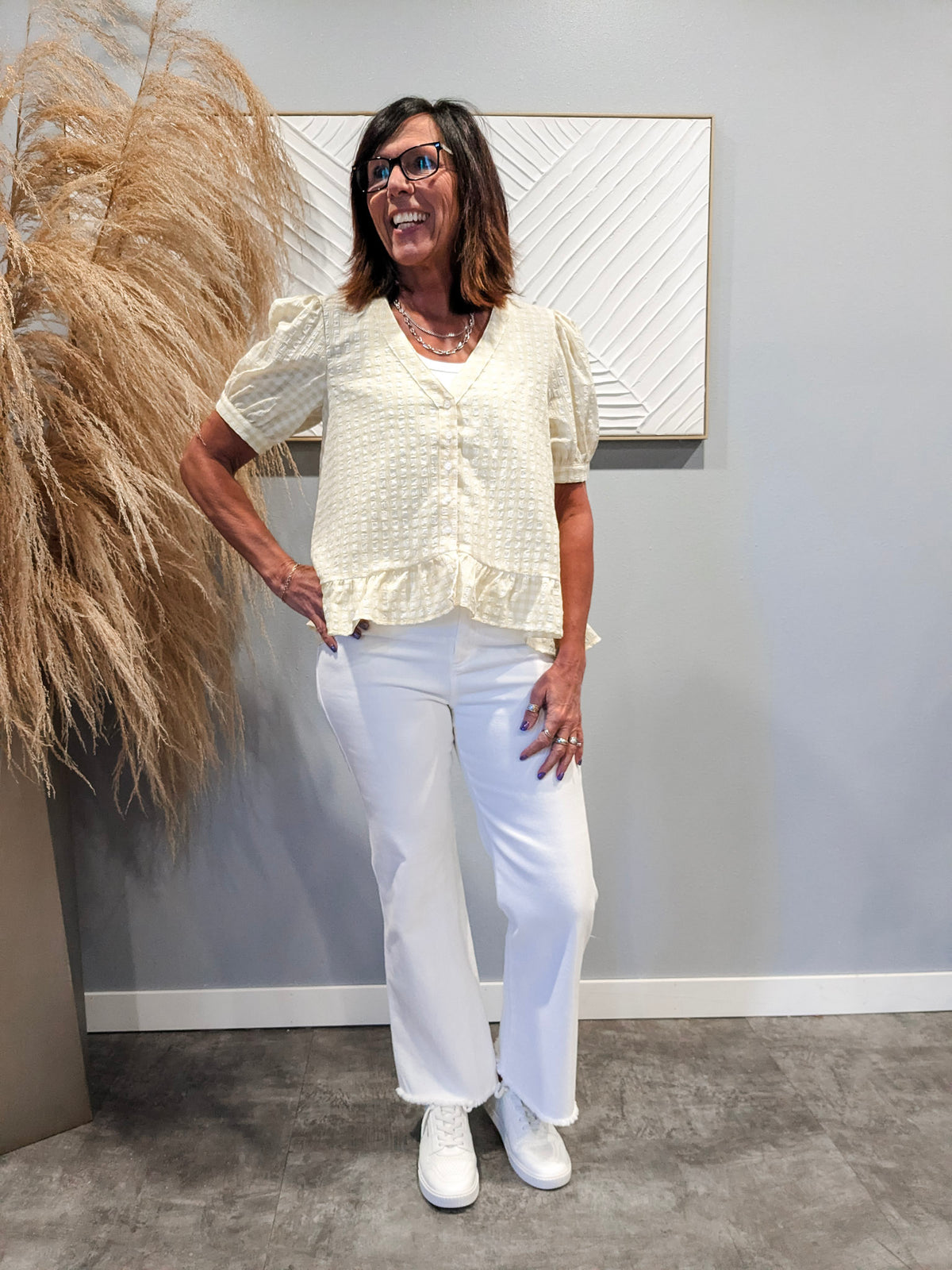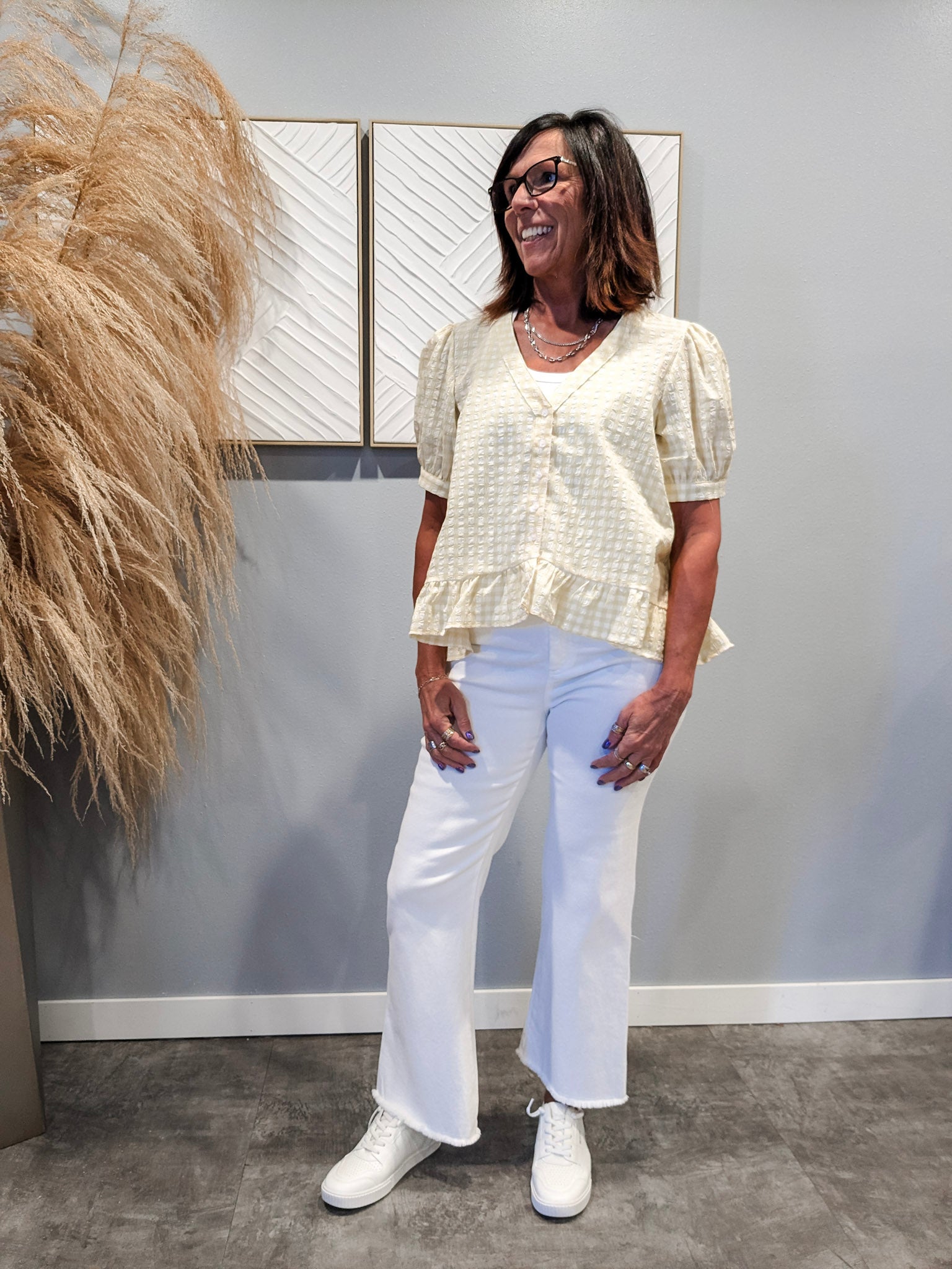 Special details: Short puff sleeve, V-neck, gingham blouse, front buttons, bottom ruffles.